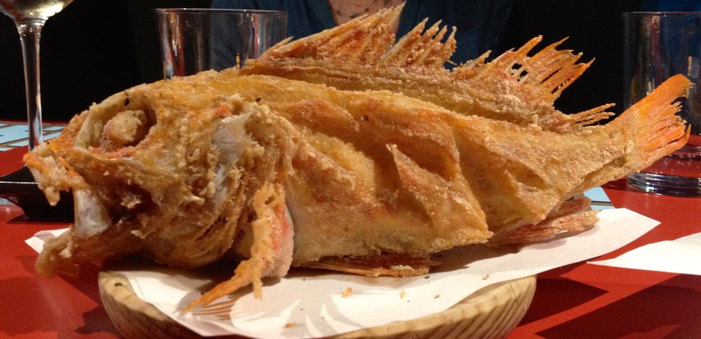 In the back, with perhaps four tiny high-top tables and stools, was a seasonal oyster bar. A wall of nondescript beige tiles posted a rusting sign saying, “BAR” in red letters, and a colorful fish underneath. Below the sign behind the bar a man rapidly opened oyster shells with skills that most do not possess. They were piled high on a pan in front of him.